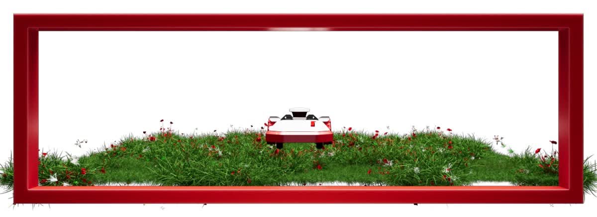 To achieve this, we built a precise 3D model of the RTK in Cinema4D and carried out a series of test renders. By animating both the mower and its environment, we calculated the exact perspective and camera position needed to deliver the illusion of the mower breaking free of the screen and hovering in mid-air. Careful lighting adjustments were made to further enhance the optical illusion.